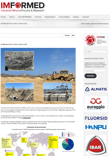 Nos dedicamos a la explotación y comercialización de mineral de andalucita con alto porcentaje de alúmina. Exportamos el material refractario desde el puerto de Paita en el Norte del Perú.